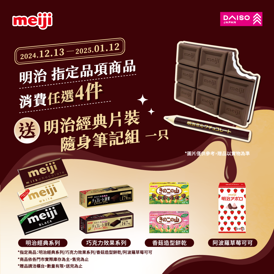 優惠內容:購買明治巧克力系列任4件,送造型隨身筆記組1組(可累贈,數量有限)